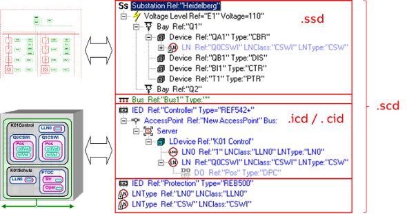 SCD (Substation Configuration Description), contenente la descrizione della sottostazione completa, composta da linea singola, bus di comunicazione e IED con nodi logici, che sono collegati alle apparecchiature primarie nella sezione della sottostazione.