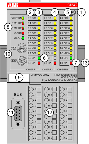 8 LED gialli visualizzano gli stati dei segnali degli ingressi digitali (DI8 ... DI15)