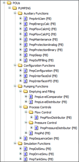 La libreria contiene i blocchi funzione necessari per le funzioni dell'applicazione di pompaggio (controllo della pressione, controllo della portata o controllo del livello). Contiene anche blocchi funzione per alcune funzioni avanzate necessarie per diverse applicazioni.