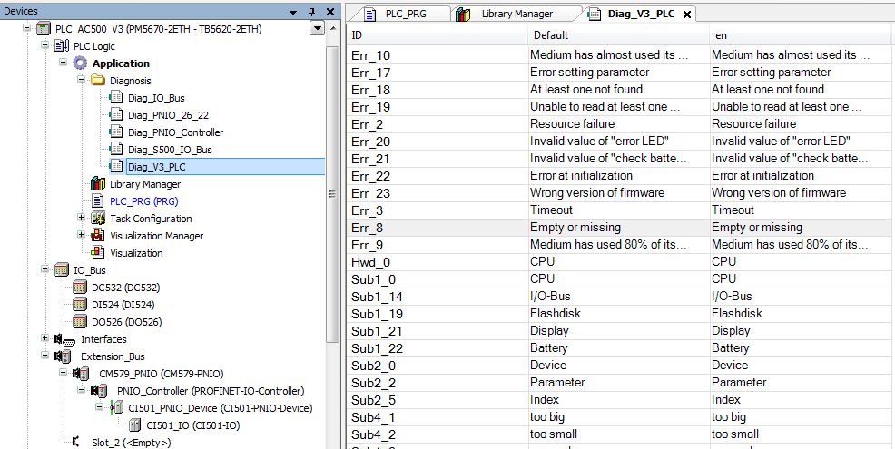 Per l'emissione di messaggi di diagnosi in formato testuale, Automation Builder e l'applicazione IEC utilizzano liste di testo. Entrambe le applicazioni utilizzano gli stessi elenchi di testo. Gli elenchi di testo fanno parte della descrizione del dispositivo. Quando si inserisce un nuovo dispositivo nell'albero dei dispositivi del progetto, viene caricato l'elenco di testo corrispondente. Questi elenchi di testo fanno parte del programma del PLC e verranno scaricati nel PLC.