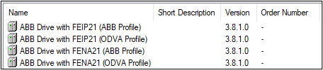 Aggiungere l'azionamento ABB basato sul modulo di comunicazione e sul profilo EtherNet/IP sotto il nodo scanner EtherNet/IP nella struttura del progetto Automation Builder. Sono disponibili le seguenti varianti di unità ABB tutte compatibili: