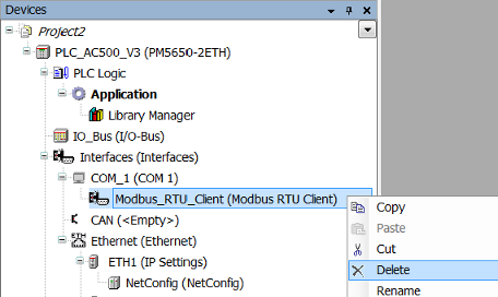 Fare clic con il tasto destro del mouse sul nodo collegato al nodo «COM_1» nella struttura dei dispositivi e fare clic su «Cancella».