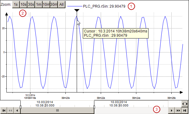 Il sito «Trend» visualizza i dati utilizzati nel database di una registrazione di trend. A differenza dell'elemento «Trace», l'elemento «Trend» è particolarmente adatto per il campionamento dei dati a lungo termine.