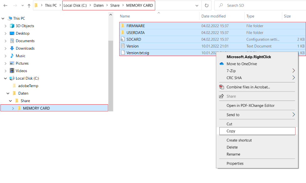 Copiare tutte le sottocartelle e i file selezionati dal lato sinistro alla scheda di memoria facendo clic su