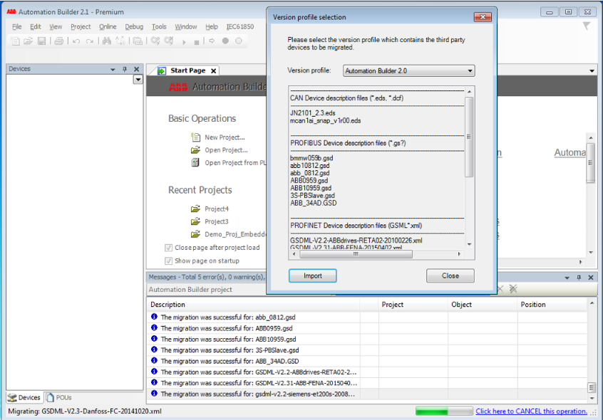 Dopo un aggiornamento di Automation Builder il repository dei dispositivi contiene solo dispositivi ABB. I dispositivi di terze parti installati nelle versioni precedenti di Automation Builder non vengono installati automaticamente nel profilo della versione più recente. Questo deve essere attivato dall'utente.
