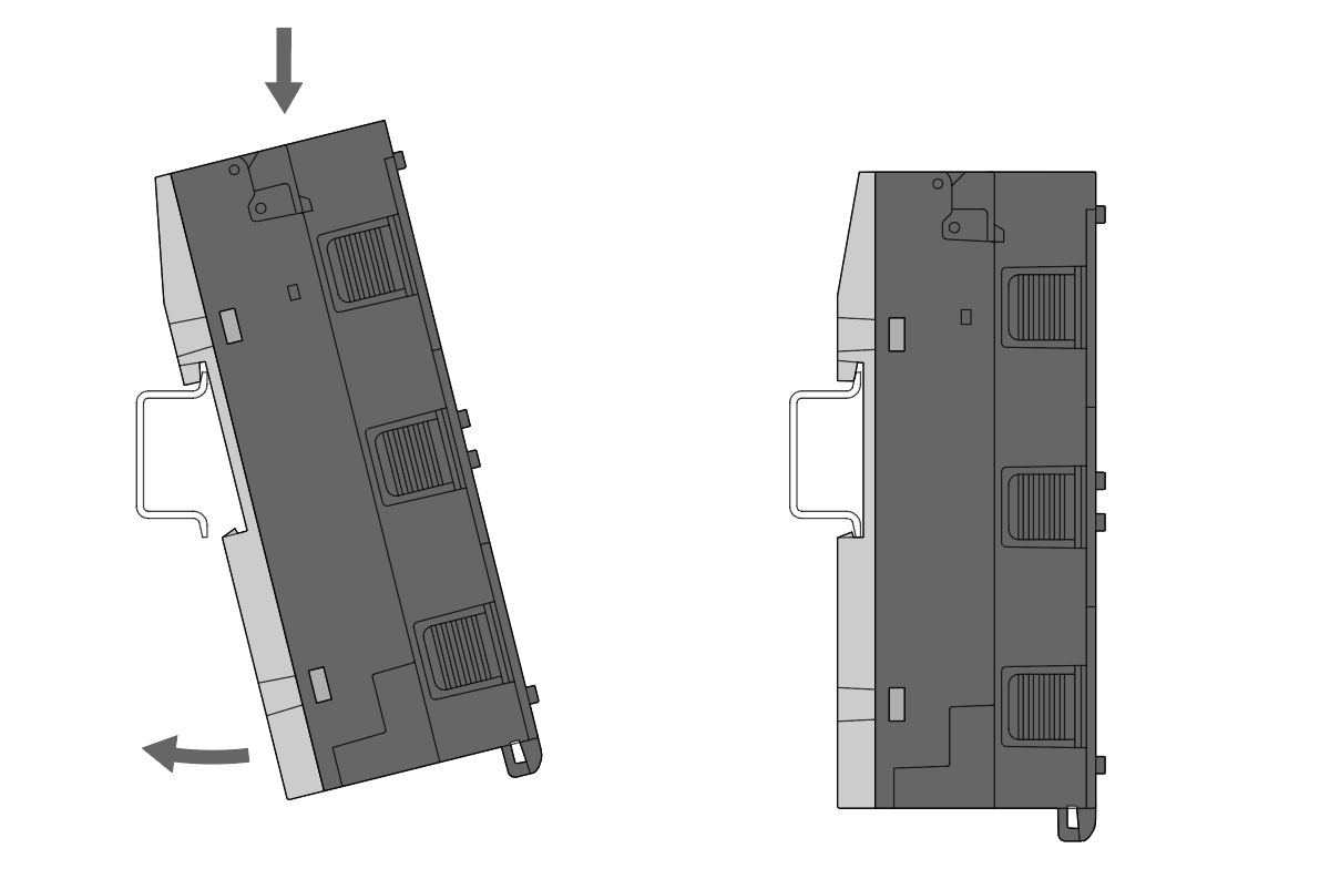 Montate il modulo del processore sulla parte superiore della guida DIN, quindi inseritelo a scatto nella parte inferiore.