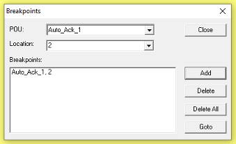 In order to set a breakpoint, choose a POU in the POU combobox and the line or the network in the Location combobox where you would like to set the breakpoint; then press the Add button. The breakpoint will be added to the list.