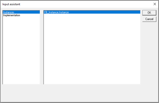 With this command it is possible to open and display the instance of the function block which is selected in the Object Organizer. In the same manner, a double click on the function block in the Object Organizer gives access to a selection dialog in which the instances of the function block as well as the implementation are listed. Select here the desired instance or the implementation and confirm using OK. The desired item is then displayed in a window.