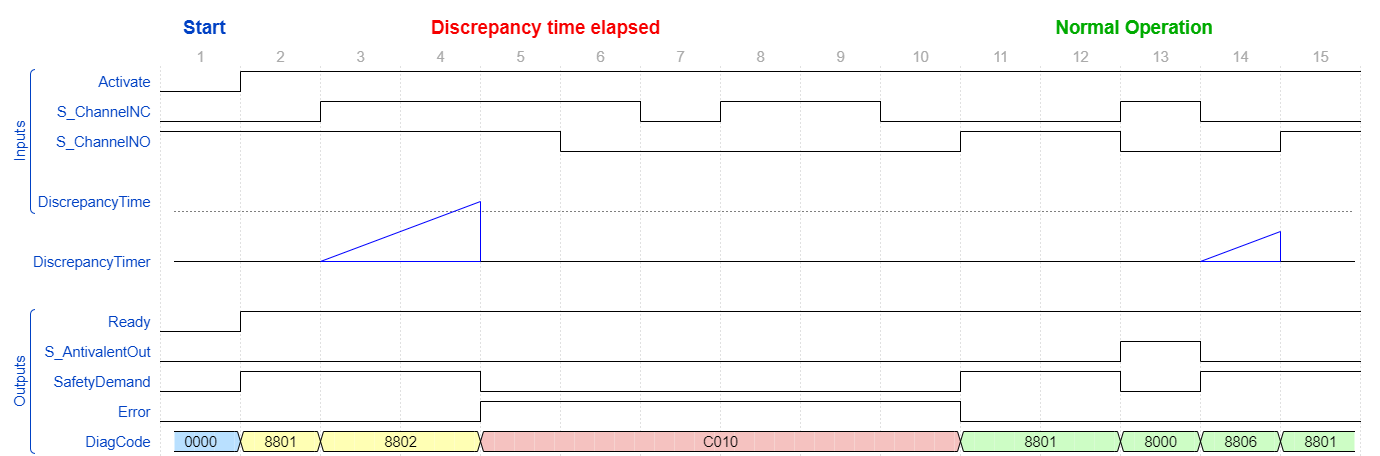 The function block monitors the discrepancy time between channel NO and channel NC.