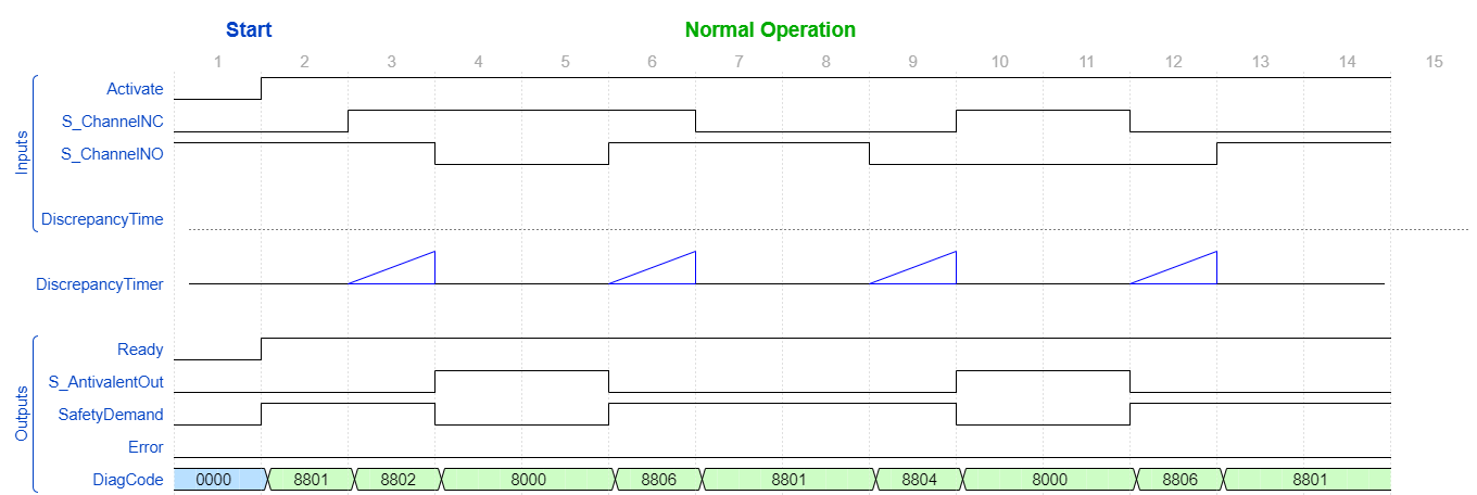 ChannelNC has been switched to TRUE - waiting for ChannelNO to be switched to FALSE; discrepancy timer started. Ready = TRUE S_AntivalentOut = FALSE SafetyDemand = TRUE Error = FALSE  |