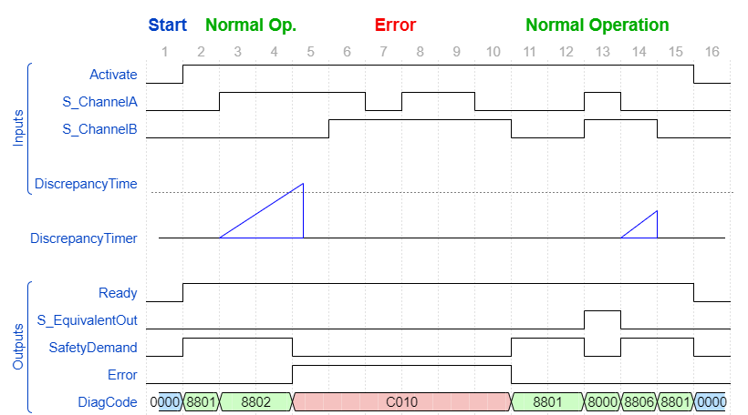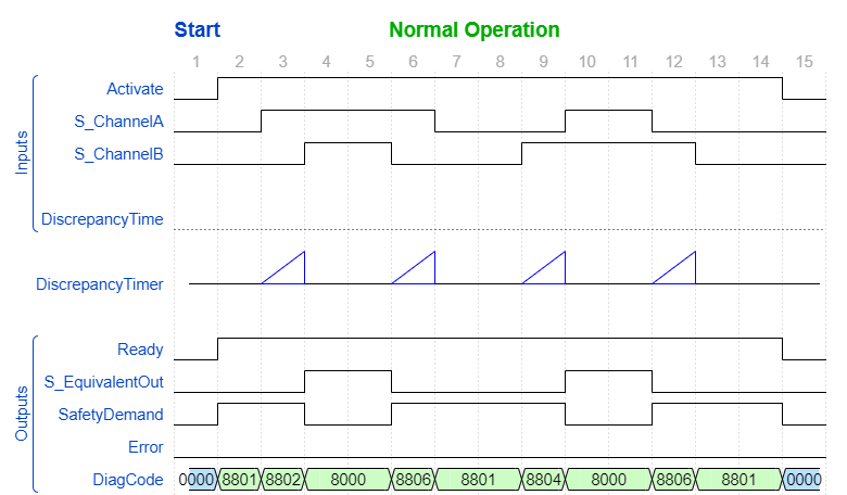 One channel has been switched to FALSE; waiting for the second channel to be switched to FALSE, discrepancy timer started. Ready = TRUE S_EquivalentOut = FALSE SafetyDemand = TRUE Error = FALSE  |
