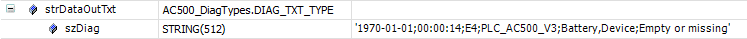 Il testo dell'errore stesso, composto dall'interpretazione di dwSubSysteminfo e dwAdditional e dal testo dell'errore più il rimedio (se disponibile) dall'elenco di testi Automation Builder secondo dwErrorCode. Visualizzato come: testo dell'errore -> rimedio.